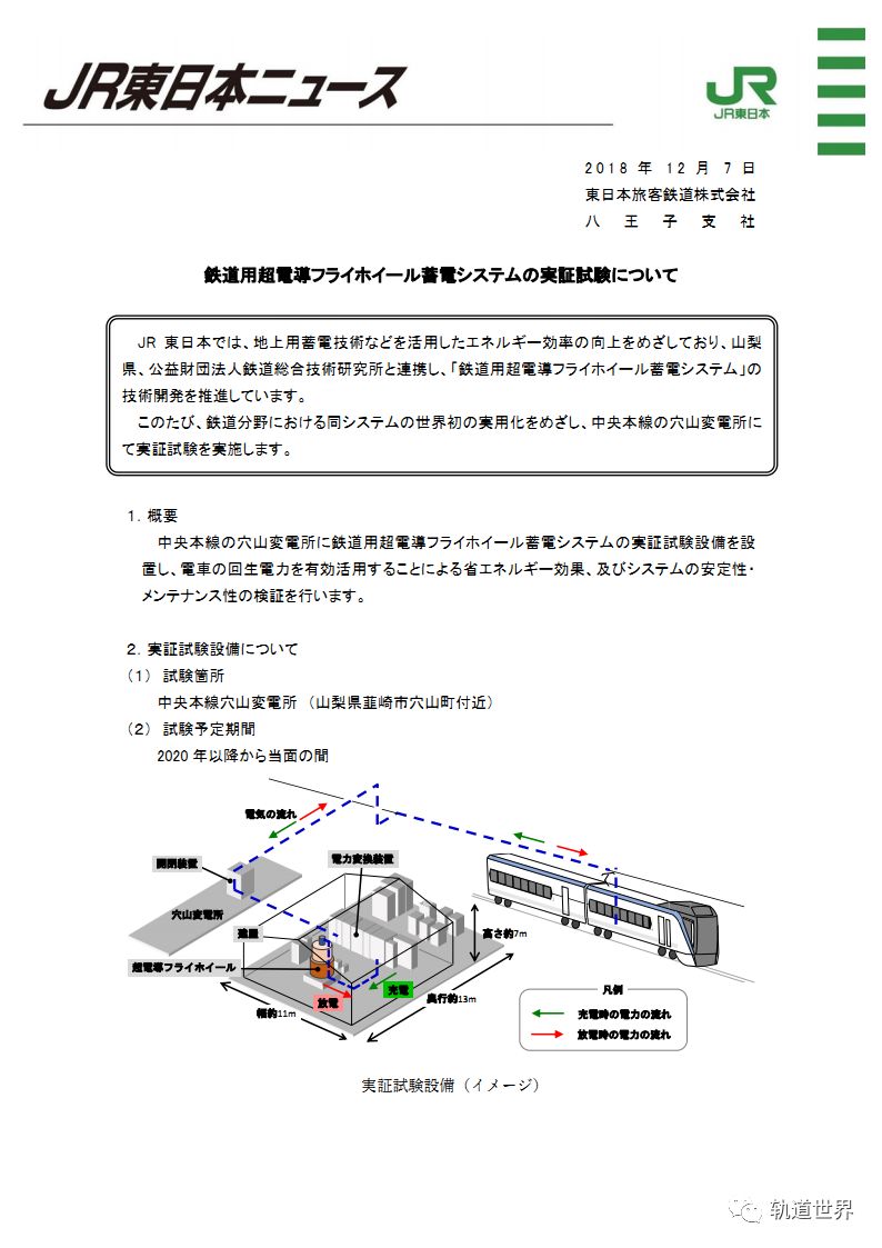 JR東日本官網(wǎng)消息:為了提高能源效率將靈活運(yùn)用地上用儲(chǔ)能技術(shù),該公司與相關(guān)鐵道綜合技術(shù)研究所合作聯(lián)合開發(fā)鐵路電力牽引用超導(dǎo)飛輪儲(chǔ)能系統(tǒng)。