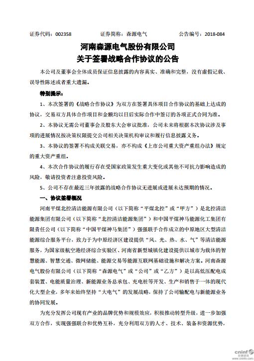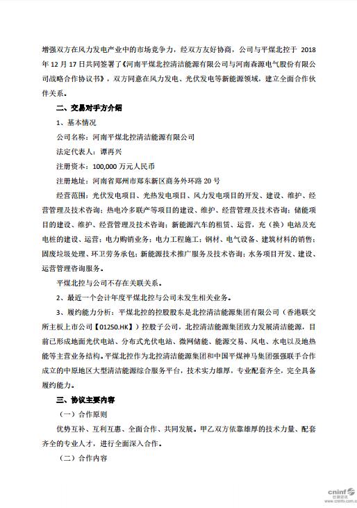 北極星風(fēng)力發(fā)電網(wǎng)獲悉,近日森源電氣發(fā)布公告稱,與河南平煤北控清潔能源有限公司于2018 年12月17日簽署戰(zhàn)略合作協(xié)議書,雙方同意在風(fēng)力發(fā)電、光伏發(fā)電等新能源領(lǐng)域,建立全面合作伙伴關(guān)系。