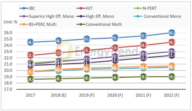 圖1:各種硅晶電池的效率趨勢(shì)預(yù)測(cè)