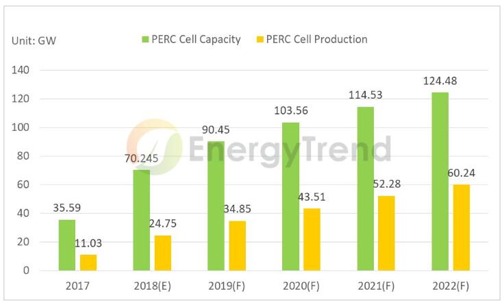 由集邦新能源網(wǎng)EnergyTrend先進(jìn)技術(shù)報(bào)告可知,截至2017年底,全球PERC產(chǎn)能達(dá)35.59GW;預(yù)計(jì)到2018年底,全球PERC產(chǎn)能將達(dá)到70.245GW以上;而2019年P(guān)ERC存量產(chǎn)能在90GW以上。而根據(jù)測(cè)算,2018-2020年全球光伏新增裝機(jī)量保守估計(jì)分別約為103GW、108GW、110GW。目前,市場(chǎng)仍舊是PERC和非PERC產(chǎn)品并存的局面,只是單晶PERC電池的競(jìng)爭(zhēng)力強(qiáng),會(huì)擠壓多晶PERC和一般單晶的生存空間。而當(dāng)下全球市場(chǎng)的需求仍舊超過(guò)所有PERC產(chǎn)能的供給能力,因此非PERC產(chǎn)品依舊保有一定比例,但相比之下競(jìng)爭(zhēng)力比較弱。再加之單晶PERC性價(jià)比最高,所以比起其他產(chǎn)品,也更具擴(kuò)產(chǎn)搶占市場(chǎng)的可能性。
