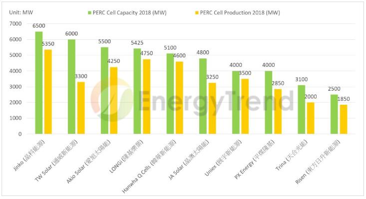 圖3:全球前10大PERC電池廠家產(chǎn)能與產(chǎn)出