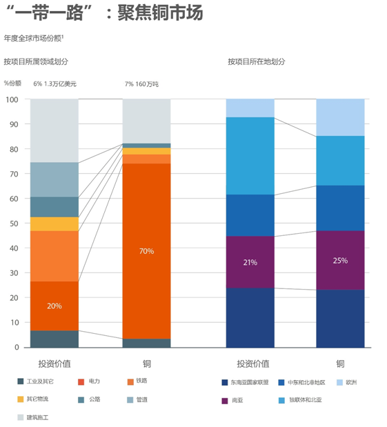 我們的研究顯示,針對(duì)銅的需求量將大幅增長(zhǎng)。“一帶一路”項(xiàng)目將帶來(lái)160萬(wàn)噸精煉銅的額外需求,相當(dāng)于2017年全球年需求量的7%。