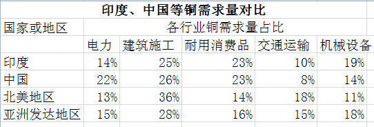 這一點(diǎn)也可從以下具有代表性的低、中、高收入地區(qū)的分行業(yè)銅量需求對(duì)比予以說(shuō)明。