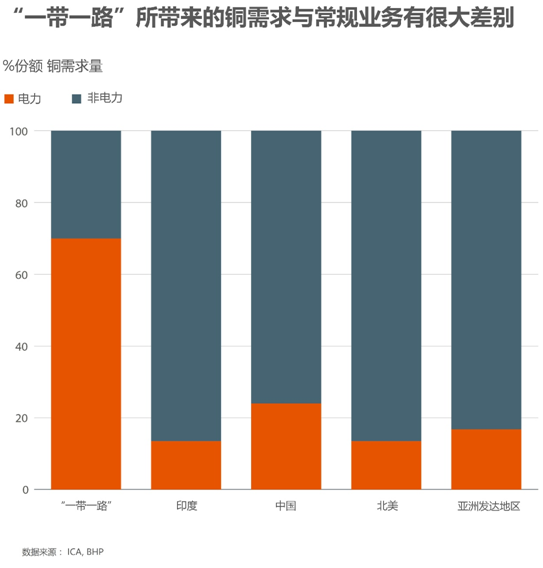 基于這些數(shù)據(jù),我們看到在經(jīng)濟(jì)發(fā)展的任何階段,僅靠電力項(xiàng)目不足以支撐對(duì)銅量需求終端產(chǎn)業(yè)自然增長(zhǎng)的70%。在上述羅列的主要地區(qū)中,沒(méi)有任何單一領(lǐng)域的銅需求量占比超過(guò)36%。我們預(yù)計(jì),隨著電力應(yīng)用規(guī)模的不斷擴(kuò)大,以及可靠的跨境業(yè)務(wù)和國(guó)內(nèi)物流體系建設(shè),“一帶一路”地區(qū)將會(huì)涌現(xiàn)出更多銅應(yīng)用產(chǎn)業(yè)。