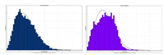 我們將問題拆分開,分別看一下兩個場區(qū)的風速分布以及對應的威布爾分布?梢钥吹綀鰠^(qū)A的風速分布與威布爾曲線擬合的較好,場區(qū)B的風速分布與威布爾曲線的相關性只有0.88。此外,我們可以看出,兩個場區(qū)在9-12米每秒的風速區(qū)間中,風速頻率相差較大,這段風速區(qū)間剛好是風機接近滿發(fā)時的風速。因此雖然場區(qū)B的整體平均風速與場區(qū)A相比略小,然而他的風速分布更利于風機出力。