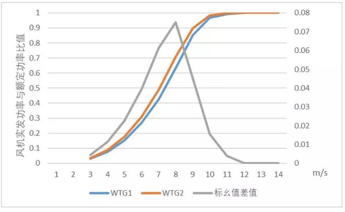 此外,在風機型號的選擇上也導致場區(qū)A的發(fā)電量不及預期。如圖是兩個場區(qū)所使用風機的功率曲線標幺值以及對應的標幺值差值。我們可以看出,標幺值差值在7-9米每秒的風速區(qū)間達到峰值,說明在這個風速段中,兩種風機的發(fā)電性能是有較大差異的。針對不同風資源特性的場區(qū),需要對癥下藥,選擇匹配度最高的風機,以獲得最大收益,減少資源浪費。