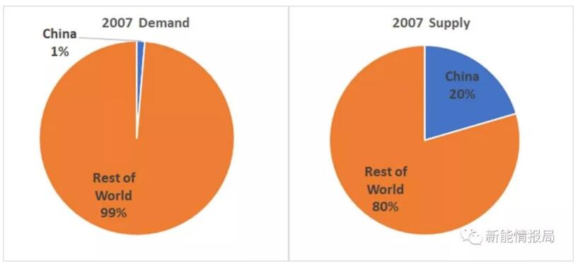 圖2給出了2007年時(shí)中國光伏的需求和供應(yīng)份額。彼時(shí),歐洲FIT政策驅(qū)動(dòng)了裝機(jī)需求,但由于多晶硅的短缺,光伏技術(shù)價(jià)格偏高,光伏行業(yè)的利潤還是比較不錯(cuò)的。當(dāng)時(shí)全球市場在3.1GW左右,中國的需求占比還是1%,且主要應(yīng)用還是離網(wǎng)。