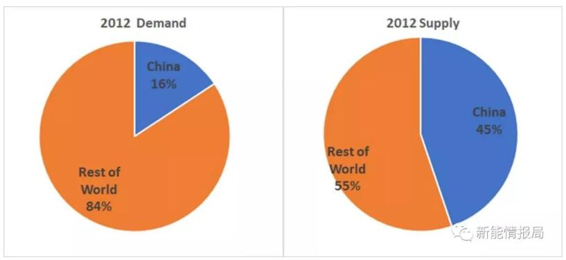 圖3則顯示了2012年時(shí)中國光伏的需求和供應(yīng)份額。從圖中也可以看出,此時(shí)中國國內(nèi)的光伏裝機(jī)量已經(jīng)有了顯著的增長。