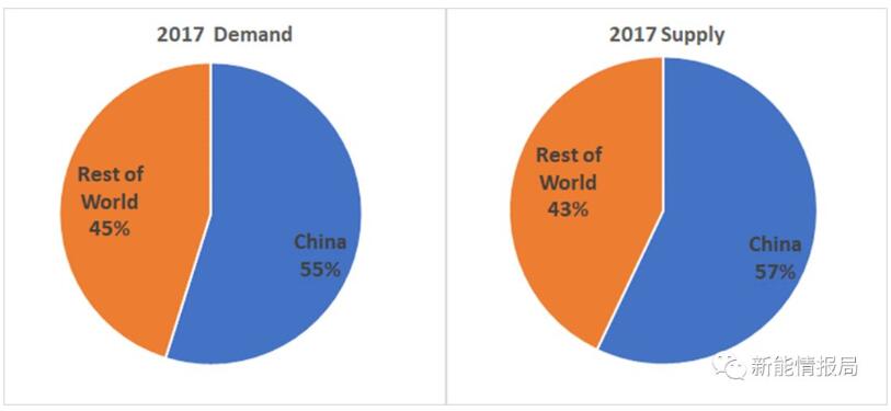 圖4則顯示了2017年時(shí)中國光伏的需求和供應(yīng)份額。到了2017年,中國已經(jīng)主導(dǎo)了全球光伏的需求和供應(yīng)。中國光伏的需求占比為55%,組件的出貨更是占據(jù)了絕對(duì)主導(dǎo)地位,達(dá)到了57%。