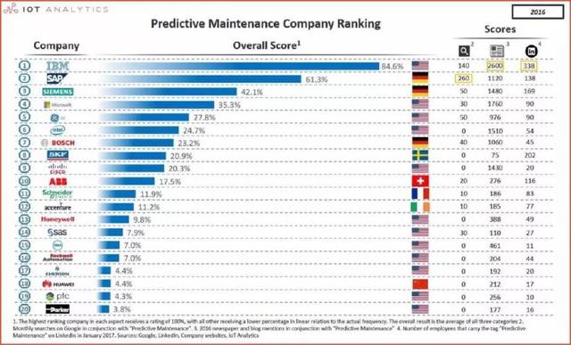 從IOT Analytical發(fā)布的2016年全球物聯(lián)網(wǎng)企業(yè)前20強名單來看,大部分企業(yè)都是美國的企業(yè),這與美國作為世界互聯(lián)網(wǎng)技術(shù)中心的地位有關(guān)。而德國的SAP和西門子兩家企業(yè)位居第二第三,這與德國近幾年將“工業(yè)4.0”作為國家戰(zhàn)略目標(biāo)密不可分。在前20強中只有一家中國企業(yè),即華為。