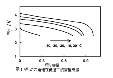 鋰動(dòng)力電池在不同低溫下的放電容量曲線如圖1所示,與室溫20℃相比,低溫-20℃下容量衰減已經(jīng)比較明顯,到-30℃是容量損失更多,-40℃下容量連一半都不到了。
