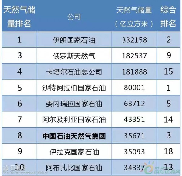天然氣儲量:TOP10共102萬億立方米