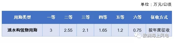 風(fēng)機基礎(chǔ)作為透水構(gòu)筑物,按照海域等級來進行海域使用金的征收,具體如下表所示: