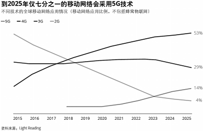 4G于2009年末2010年初推出之后僅有小部分運(yùn)營商在有限的部分地區(qū)提供4G服務(wù)。雖然在推出后的10年間4G網(wǎng)絡(luò)的布局范圍越來越廣,但直到2019年4G才成為全球用戶最多的無線聯(lián)網(wǎng)技術(shù)。全球移動(dòng)通信系統(tǒng)聯(lián)盟(GSMA)的報(bào)告顯示,全球范圍內(nèi)的4G網(wǎng)絡(luò)用戶要到2023年才能超過網(wǎng)絡(luò)用戶總數(shù)的50%,距離4G網(wǎng)絡(luò)最初啟用已過去14年。這意味著到2025年,5G可能仍是一種相對小眾的技術(shù)。該年度的5G用戶數(shù)有望達(dá)到12億,但也僅占全球非物聯(lián)網(wǎng)移動(dòng)網(wǎng)絡(luò)用戶總數(shù)的14%。與此同時(shí),不同國家的5G網(wǎng)絡(luò)應(yīng)用情況也存在巨大差異:到2025年,美國將有49%的用戶使用5G網(wǎng)絡(luò),日本、歐洲、中國的這一比例分別為45%、31%和25%,而拉丁美洲、中東和非洲的這一百分比僅為個(gè)位數(shù)。十年以后,供應(yīng)商們可能仍在推廣5G。