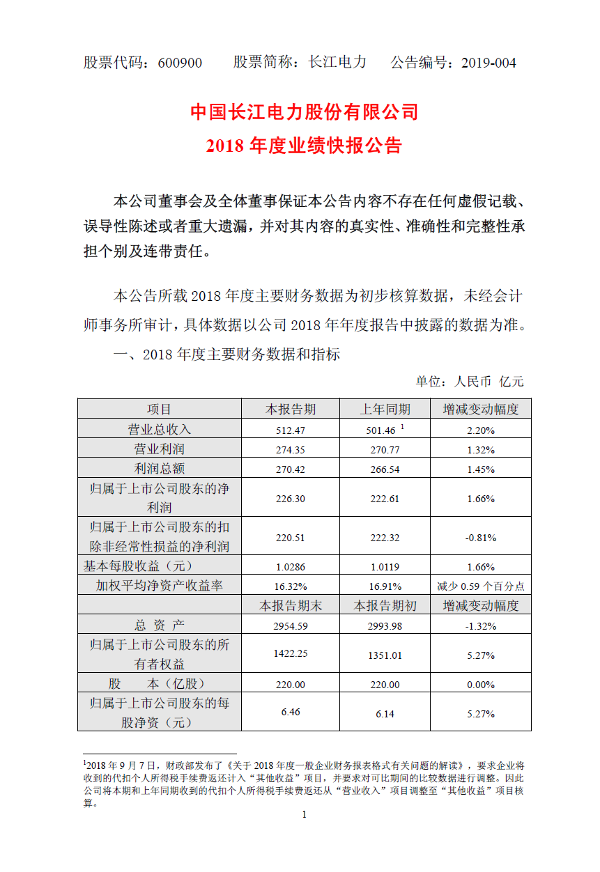 長(zhǎng)江電力公告,2018年實(shí)現(xiàn)凈利潤(rùn)226.30億元,同比增長(zhǎng)1.66%。2018年,公司實(shí)現(xiàn)利潤(rùn)總額270.42億元,比上年同期上升1.45%,歸屬于上市公司股東的凈利潤(rùn)226.30億元,比上年同期上升1.66%,基本每股收益1.0286元,比上年同期上升1.66%。以上指標(biāo)變動(dòng)主要是由于2018年公司售電收入增加所致。詳情如下: