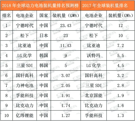 綜合各種因素,電池中國(guó)網(wǎng)對(duì)2018年全球動(dòng)力電池裝機(jī)量排行榜預(yù)測(cè)如下: