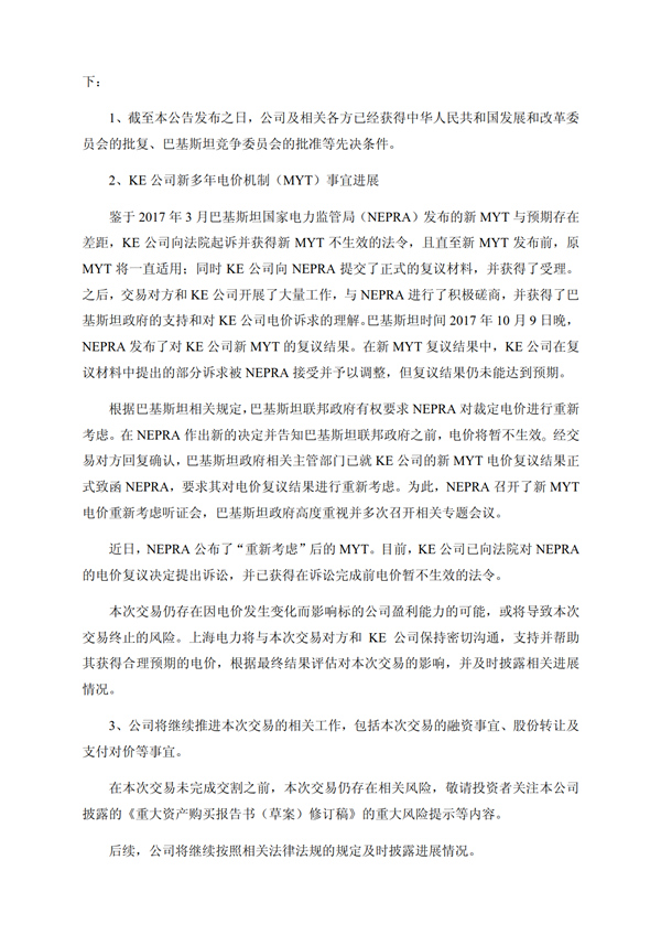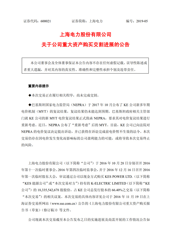 北極星電力網(wǎng)獲悉,日前國家電投旗下上市公司上海電力發(fā)布了關(guān)于公司重大資產(chǎn)購買交割進(jìn)展的公告。近日,NEPRA公布了“重新考慮”后的MYT。目前,KE公司已向法院對NEPRA的電價(jià)復(fù)議決定提出訴訟,并已獲得在訴訟完成前電價(jià)暫不生效的法令。本次交易仍存在因電價(jià)發(fā)生變化而影響標(biāo)的公司盈利能力的可能,或?qū)?dǎo)致本次交易終止的風(fēng)險(xiǎn)。