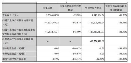 2018年前三季度,公司實(shí)現(xiàn)營(yíng)業(yè)收入434萬(wàn),大幅下滑99.5%;虧損了1.27億元;經(jīng)營(yíng)活動(dòng)現(xiàn)金流凈額為-8372萬(wàn)。