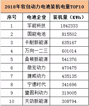 高工產(chǎn)研鋰電研究所(GGII)數(shù)據(jù)顯示,2018年新能源汽車軟包動力電池裝機(jī)總電量約7.62GWh,占整體總裝機(jī)電量的13.4%。其中,排行前十的動力電池企業(yè)的軟包電池裝機(jī)電量約6.31GWh,占據(jù)軟包電池裝機(jī)總電量的82.8%。