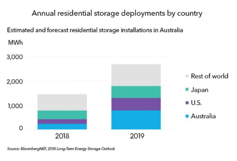 在越來越多的住宅電池補貼計劃被納入州和地區(qū)能源政策的背景下,澳大利亞正在成為全球最大的儲能市場。根據(jù)BNEF發(fā)布的最新預測,澳大利亞的戶用電池數(shù)量將在2019年增加三倍。這將使澳大利亞成為世界上最熱門的戶用儲能市場,占全球需求的30%。