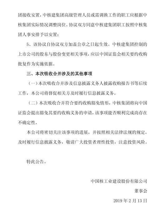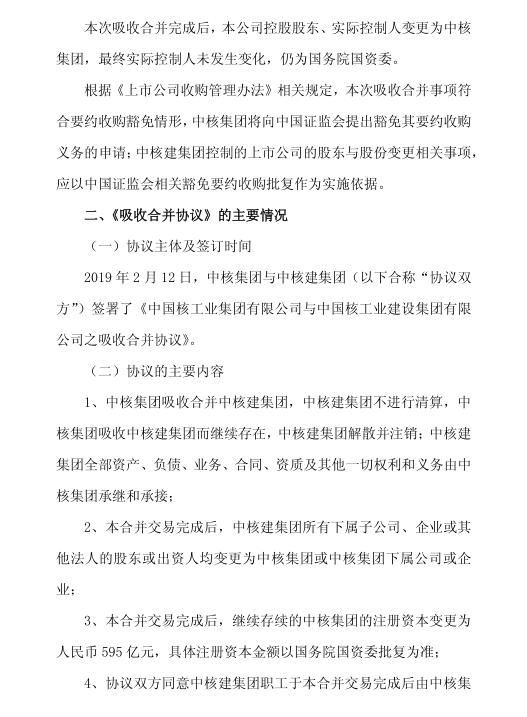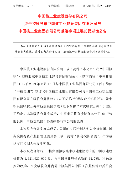北極星電力網(wǎng)獲悉,中國核建2月13日發(fā)布公告,公司控股股東中國核工業(yè)建設(shè)集團(tuán)有限公司已于2019年2月12日與中國核工業(yè)集團(tuán)有限公司簽訂《中國核工業(yè)集團(tuán)有限公司與中國核工業(yè)建設(shè)集團(tuán)有限公司之吸收合并協(xié)議》,就中核集團(tuán)吸收合并中核建集團(tuán)事項進(jìn)行了約定。此次吸收合并完成后,中核集團(tuán)將直接持有公司61.78%的股份,中核建集團(tuán)不再直接持有公司的股份。此次吸收合并實施完成后,中國核建的實際控制人變?yōu)橹泻思瘓F(tuán)。
