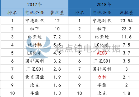 2017&2018年全球動(dòng)力電池裝機(jī)量top10對(duì)比