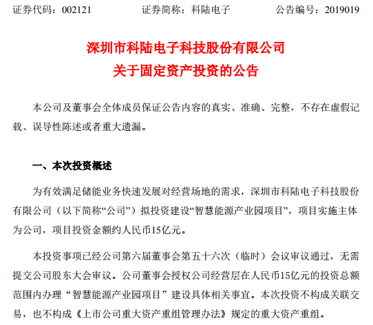 科陸電子近日發(fā)布公告,擬投資人民幣15億元建設(shè)“智慧能源產(chǎn)業(yè)園項(xiàng)目”,以滿足儲(chǔ)能業(yè)務(wù)快速發(fā)展對(duì)經(jīng)營(yíng)場(chǎng)地的需求。此外還將向華夏銀行深圳后海支行申請(qǐng)4億元綜合授信。