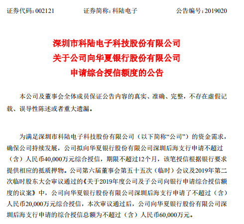 同時(shí)科陸電子還發(fā)布公告稱擬向華夏銀行股份有限公司深圳后海支行申請(qǐng)不超過(含)人民幣40,000萬元綜合授信,結(jié)合此前已申請(qǐng)的20,000萬元綜合授信,總額已達(dá)6億元。