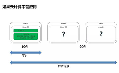 這里舉個例子:比如說實現(xiàn)一個電商的應(yīng)用,平時十臺機(jī)器就夠了,雙十一需要一百臺。你可能覺得很好辦啊,有了IaaS,新創(chuàng)建九十臺機(jī)器就可以了啊。但90臺機(jī)器創(chuàng)建出來是空的,電商應(yīng)用并沒有放上去,只能讓公司的運(yùn)維人員一臺一臺的弄,需要很長時間才能安裝好的。