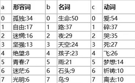 有一位網(wǎng)友統(tǒng)計了知名歌手在大陸發(fā)行的 9 張專輯中 117 首歌曲的歌詞,同一詞語在一首歌出現(xiàn)只算一次,形容詞、名詞和動詞的前十名如下表所示(詞語后面的數(shù)字是出現(xiàn)的次數(shù)):