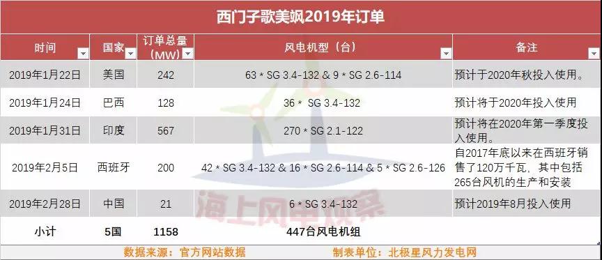 據(jù)其官網(wǎng)公布的2019年初訂單顯示,2019年西門子歌美颯已與美國、巴西、印度等5國簽訂了共計1158MW風(fēng)電訂單,將提供447臺風(fēng)電機組。具體信息如下表:
