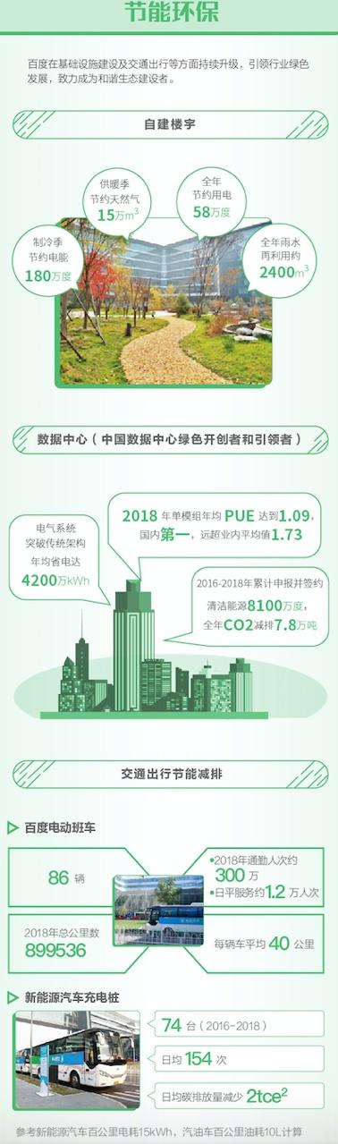近日,百度發(fā)布《2017-2018百度企業(yè)社會責任報告》,報告中闡述了過去兩年百度在履行社會責任方面的實踐和思考,其中百度憑借領(lǐng)先技術(shù)在節(jié)能環(huán)保方面成效卓著,值得業(yè)界借鑒。報告提到,百度已在自建樓宇、綠色出行、建設(shè)綠色數(shù)據(jù)中心等方面實現(xiàn)大幅節(jié)能減排,在2018年僅通過引入清潔能源,全年CO2減排就已達到7.8萬。百度是中國數(shù)據(jù)中心綠色開創(chuàng)者和引領(lǐng)者,通過電氣系統(tǒng)突破傳統(tǒng)架構(gòu)、部署國內(nèi)首批內(nèi)置鋰電池的整機柜服務器、引入清潔能源能等措施,提高供電效率、減少碳排放。