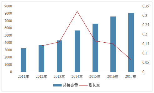 圖表 1:2011-2017年我國燃?xì)獍l(fā)電裝機(jī)容量(單位:萬千瓦)