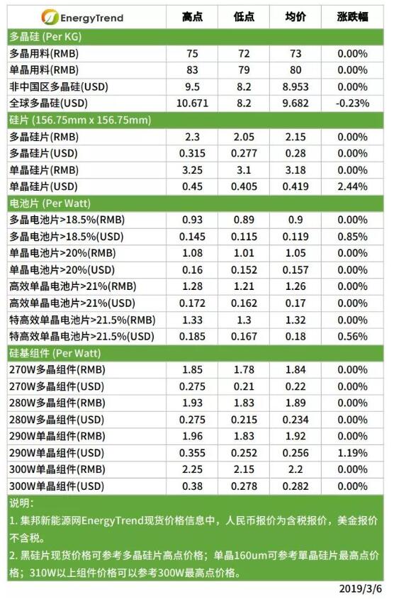 本周組件市場維持平靜的氛圍,估計與虛弱的需求有關(guān)聯(lián)。目前中國海內(nèi)外市場都沒有太大變化,一般多晶組件價格維持在1.78~1.85RMB/W,高效多晶組件價格維持在1.83~1.93RMB/W,一般單晶組件價格維持在1.83~1.96RMB/W,高效單晶組件價格維持在2.15~2.3RMB/W,特高效單晶(>310W)組件價格則是維持在2.30RMB/W的價位。海外一般多晶組件價格維持在0.21~0.275USD/W,高效多晶組件價格維持在0.215~0.275USD/W;一般單晶組件價格維持在0.252~0.355USD/W,均價上調(diào)至0.256USD/W,高效單晶組件價格維持在0.278~0.38USD/W,特高效單晶組件價格則是下修至0.286USD/W的價位。