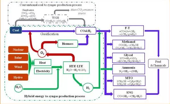 孫予罕和唐志永團(tuán)隊圍繞“低碳復(fù)合能源系統(tǒng)”的系統(tǒng)集成思路,針對煤炭在化工利用過程富碳缺氫的特點,通過低碳能源制氫技術(shù)耦合煤氣化工藝生產(chǎn)燃料和化學(xué)品,實現(xiàn)了煤化工過程的碳?xì)淦胶,取消傳統(tǒng)煤化工直接碳排放的源頭—水煤氣變換工藝,大幅提高了煤炭利用過程的能效和碳效并使得碳排放顯著下降,經(jīng)濟(jì)性分析也表明低碳復(fù)合能源系統(tǒng)在未來隨著低碳能源價格的下降和碳稅的征收將極具競爭力。