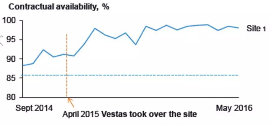 圖中的曲線是客戶位于澳洲多個風(fēng)場共計(jì)+150 MW風(fēng)電資產(chǎn)的綜合時(shí)間可利用率情況,在2015年4月之前風(fēng)場由客戶或第三方運(yùn)營,其可利用率一直在90%左右徘徊,最高的時(shí)候不超過93%。維斯塔斯服務(wù)團(tuán)隊(duì)于2015年四月接手風(fēng)場的運(yùn)營,僅僅六個月后,維斯塔斯就將風(fēng)場的表現(xiàn)明顯改善并維持在一個高水平。