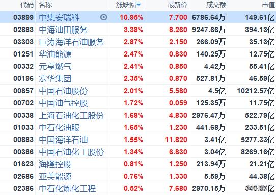 格隆匯22日訊,早盤,“三桶油”繼續(xù)活躍,油氣產(chǎn)業(yè)鏈個股整體走高。中集安瑞科(03899.HK)、中海油田服務(wù)(02883.HK)、中石油(00857.HK)等漲幅居前。近幾日,國際油價反彈明顯,基本收復(fù)了2月初以來的下跌區(qū)間。隔夜美國原油庫存意外大降,令油價繼續(xù)擴(kuò)大漲幅。同時,今明兩日,中石油和中石化將發(fā)布年度業(yè)績。中石油預(yù)計(jì)2017年年度實(shí)現(xiàn)歸母凈利潤約209億元-239億元,同比增長165%到203%?鄯呛笤龇,將增長835%到949%。業(yè)績上升的原因是原油、天然氣、成品油等主要產(chǎn)品平均價格同比上升。此外,板塊內(nèi)也有個股的發(fā)布了向好的業(yè)績,同樣刺激了股價走高。