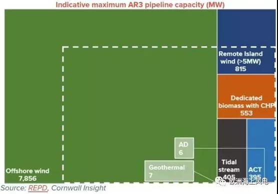 從上圖可大致看清本次CfD競(jìng)標(biāo)的競(jìng)爭(zhēng)態(tài)勢(shì)和中標(biāo)技術(shù)類(lèi)型的容量組合。第三輪CfD競(jìng)標(biāo)面向海上風(fēng)電、遠(yuǎn)海島嶼風(fēng)電、生物質(zhì)熱電聯(lián)產(chǎn)、潮流能等不成熟可再生能源技術(shù),其中可能參與競(jìng)標(biāo)的海上風(fēng)電項(xiàng)目容量將達(dá)到7856MW,占全部可能參與競(jìng)標(biāo)的項(xiàng)目容量(10GW)的79%。虛線內(nèi)的裝機(jī)容量是某咨詢公司對(duì)本輪CfD的競(jìng)標(biāo)結(jié)果的預(yù)測(cè),可以明確的是,海上風(fēng)電必將是所有技術(shù)種類(lèi)中的最大贏家。