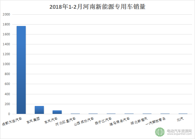 根據(jù)我們獲取的數(shù)據(jù)顯示,2018年前2個(gè)月,共有10家車企在河南進(jìn)行銷售。其中成都大運(yùn)占比高達(dá)88%,其次是東風(fēng)系有少許銷量,總得來看,結(jié)構(gòu)非常單一。據(jù)了解,實(shí)際上,1月主要還是在消化去年底的車輛,所以才有如此大的量。另外,在鄭州地區(qū)有著鄭州比克和河南一微兩家大型運(yùn)營(yíng)企業(yè),為當(dāng)?shù)匦履茉次锪鬈嚨耐茝V應(yīng)用發(fā)揮了重要作用。從上圖來看,河南本土企業(yè)大部分還沒有發(fā)力,預(yù)計(jì)后續(xù)會(huì)發(fā)揮地區(qū)優(yōu)勢(shì),乘勝追擊。