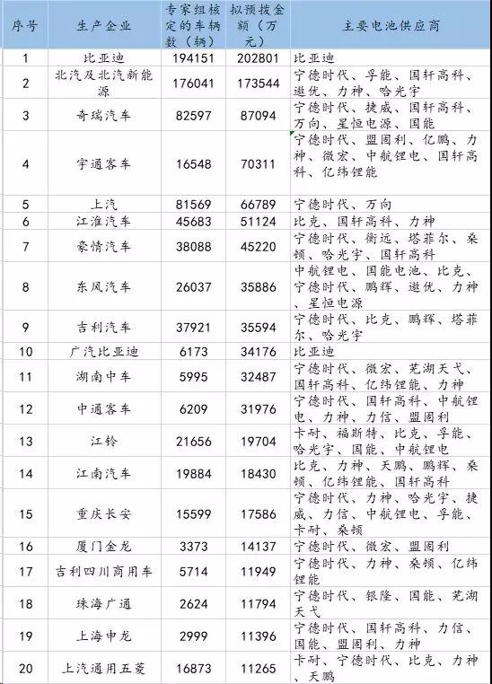 北汽及北汽新能源2017年度、2018年度專家組核定的車輛為176041輛,補(bǔ)助資金預(yù)撥通過審核金額合計(jì)173544萬元。北汽及北汽新能源主要電池供應(yīng)商包括寧德時(shí)代、孚能、國(guó)軒高科、遨優(yōu)、力神、哈光宇等。