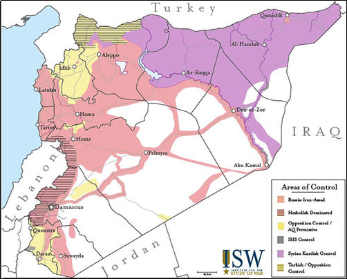 2012年開始,美國開始向敘利亞反對派勢力提供武器支持,促進(jìn)敘利亞內(nèi)戰(zhàn)進(jìn)一步升級。戰(zhàn)爭初期,巴沙爾政權(quán)四面受敵,其實(shí)際控制的區(qū)域一度僅占敘國土面積的20%左右。但隨著2015年9月底俄羅斯的軍事介入,在俄空軍支援下,敘政府軍轉(zhuǎn)守為攻,戰(zhàn)爭局勢再次發(fā)生變化。