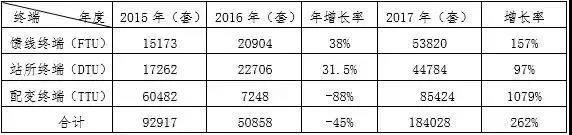 從歷史數(shù)據(jù)來看,相對(duì)于2015年和2016年,2017年配網(wǎng)招標(biāo)數(shù)量明顯井噴。2015年配網(wǎng)終端招標(biāo)總數(shù)量為92917套,2016年招標(biāo)總數(shù)量為50858套,而2017年招標(biāo)數(shù)量為184028套,比之前兩年總和還多。