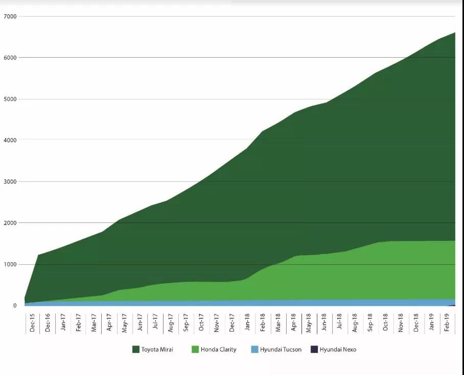 下圖為美國能源部統(tǒng)計的美國本土字2015年1月起至2019年2月的燃料電池汽車銷售累計總量。其中,豐田Mirai為2015年推出,本田Clarity隨后推出,現(xiàn)代的途勝燃料電池版現(xiàn)已停售,而現(xiàn)代Nexo作為其后續(xù)版本,于2018年開始發(fā)售。圖中,用于租賃的汽車也被計入為被銷售的汽車。