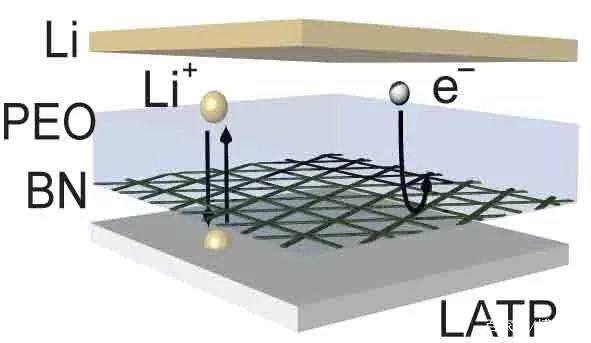 一種人造氮化硼(BN)薄膜在化學(xué)和機(jī)械上都能抵抗鋰,它通過電子方式將磷酸鋁鈦鋰(LATP)與鋰隔離,但在被聚氧乙烯(PEO)滲透時(shí)仍能提供穩(wěn)定的離子通道,從而實(shí)現(xiàn)穩(wěn)定的循環(huán)。圖片:Qian Cheng/Columbia Engineering此外,固體陶瓷電解質(zhì)具有較高的機(jī)械強(qiáng)度,實(shí)際上可以抑制鋰枝晶的生長,使鋰金屬成為電池陽極的涂層選擇。然而,大多數(shù)固體電解質(zhì)對鋰離子不穩(wěn)定,易被金屬鋰腐蝕,不能用于電池。該論文的第一作者、應(yīng)用物理和應(yīng)用數(shù)學(xué)學(xué)系博士后科學(xué)家錢成(音譯)說:鋰金屬對于提高能量密度是不可缺少的,所以我們能夠?qū)⑺米鞴腆w電解質(zhì)的陽極至關(guān)重要。為了使這些不穩(wěn)定的固體電解質(zhì)適應(yīng)實(shí)際應(yīng)用,需要開發(fā)一個(gè)化學(xué)和機(jī)械上穩(wěn)定界面來保護(hù)這些固體電解質(zhì)免受鋰陽極的傷害。