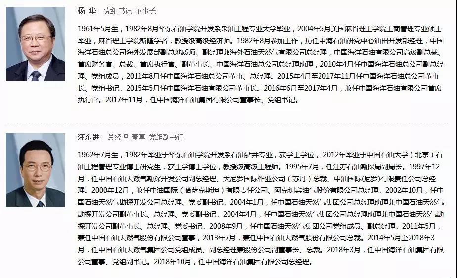 中國海洋石油董事長楊華搭檔總經(jīng)理汪東進