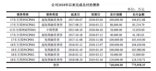公開資料顯示,2018年以來,東方園林累計兌付債券金額為77.60億。