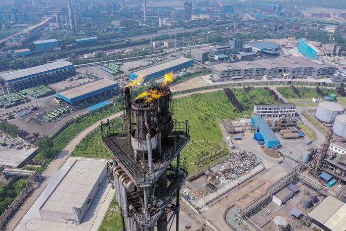 工作人員正在運用無人機對中韓石化廠區(qū)地面高壓火炬進行檢測工作。