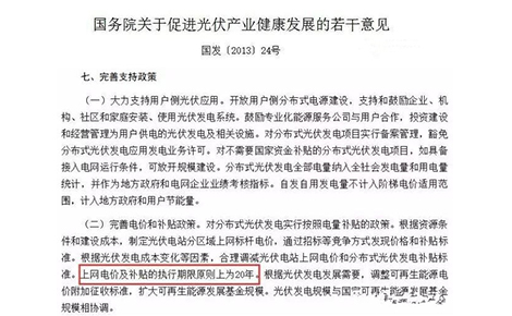 一個出處為國務院于2013年07月04日發(fā)布的國發(fā)〔2013〕24號《國務院關于促進光伏產(chǎn)業(yè)健康發(fā)展的若干意見》。其中第七大條完善支持政策中明確指出:上網(wǎng)電價及補貼的執(zhí)行期限原則上為20年。