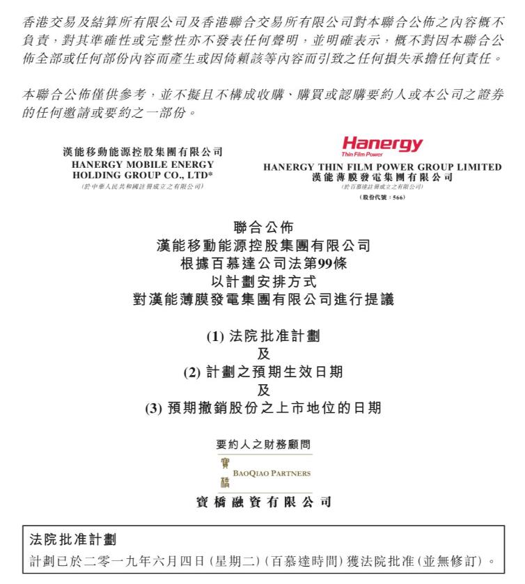 6月5日,漢能薄膜發(fā)電集團(tuán)有限公司(00566.HK)發(fā)布公告,表示5月18日“私有化”股東特別大會(huì)投票結(jié)果走完全部法律程序,已獲法院批準(zhǔn)。從去年10月23日漢能薄膜發(fā)電控股股東漢能移動(dòng)能源首次提出對(duì)旗下上市公司的私有化意向,到昨日獨(dú)立股東投票結(jié)果獲得百慕大法院批準(zhǔn),這場歷時(shí)不到8個(gè)月的漢能私有化已完成。