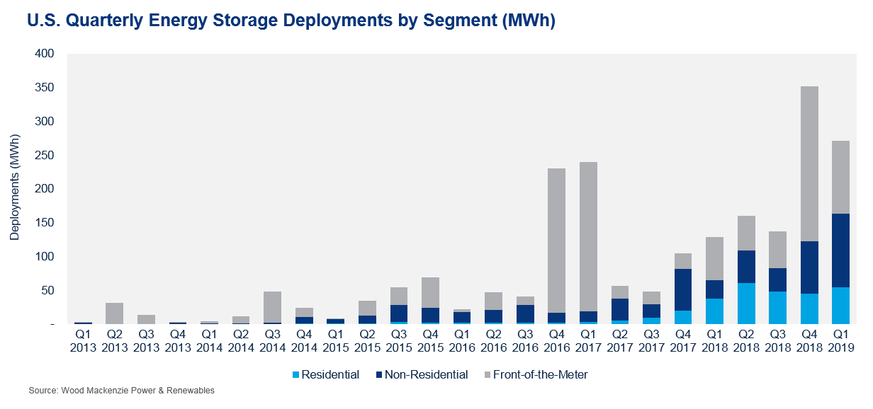 在兆瓦級部署方面,備份的能源存儲部署占所有第一季度部署的46%,比上一季度增長36%,同比增長138%。然而,在2018年底完成了一系列的前端項(xiàng)目后,按照兆瓦時(shí)的部署情況,2018年第四季度市場下降了23%。